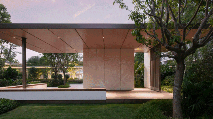 直接选用成本更高、工艺更复杂的全蜂窝铝板,将平整度和耐用性拉满,连建筑侧面、背面都做到全覆盖。