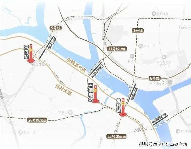 除了4条地铁交汇(广州地铁11号线、地铁22号线、地铁28号线等),白鹅潭大道贯通11公里江岸线,如意坊隧道明年通车后,东西岸通勤效率将大幅提升。