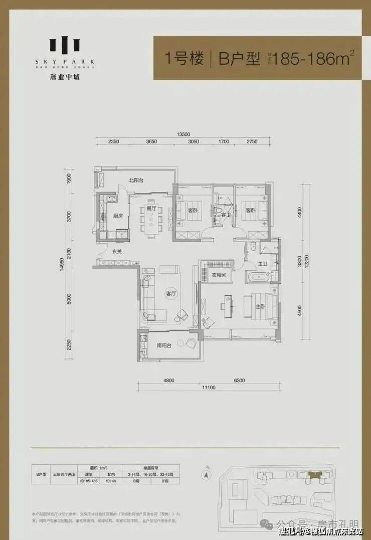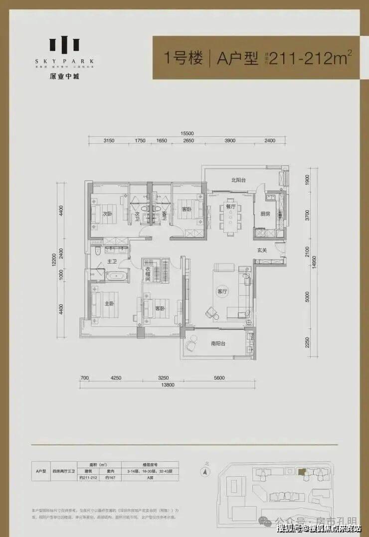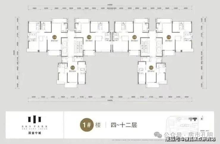 1栋:产品是面积段为137-185-192㎡的3房、212㎡的4房、以及4套300㎡以上的顶层复式单位,其中36层及以下为2梯3户“品”字形结构,37层及以上为2梯2户的板楼结构;