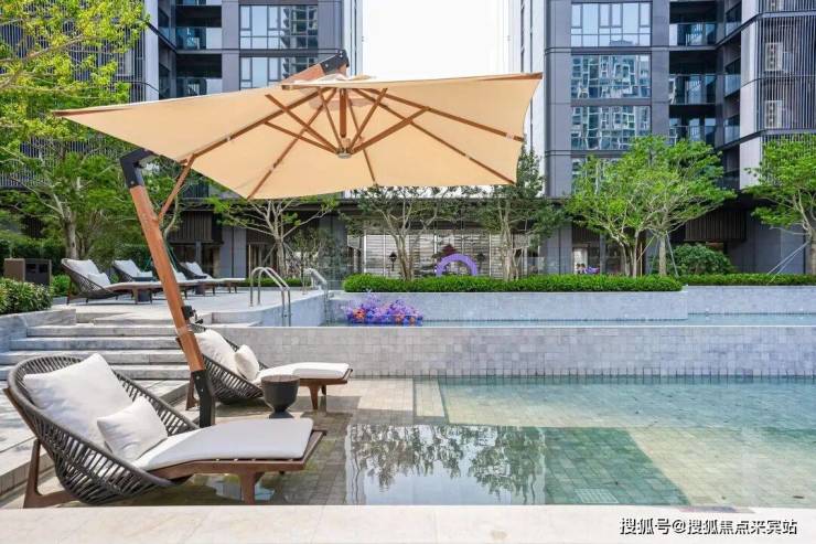 四层园林区域构建起完整的社区景观体系,无风雨归家连廊串联起大堂与核心景观区,兼顾晴雨天气的通行舒适度;跌级水景依地势打造,与中轴泳池、罗汉松形成层次分明的视觉核心,全冠移植的绿植搭配多层级造景手法,实现步移景异的景观效果。规整的外立面与城市天际线相融,没有过度繁复的设计,却以简洁利落的线条,构筑起辨识度鲜明的城市界面。