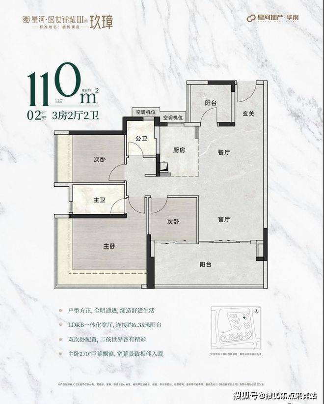 110平方米:主朝向西南,客厅、阳台和主卧尺寸超越常规,彰显尊贵风范。