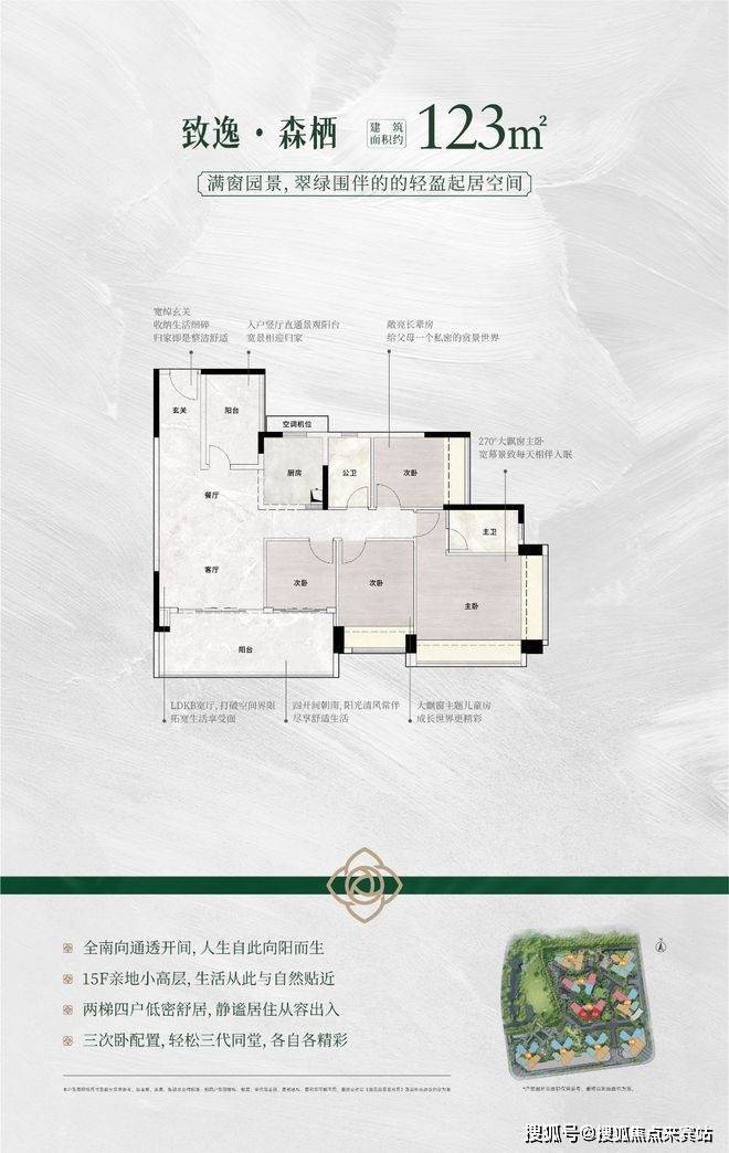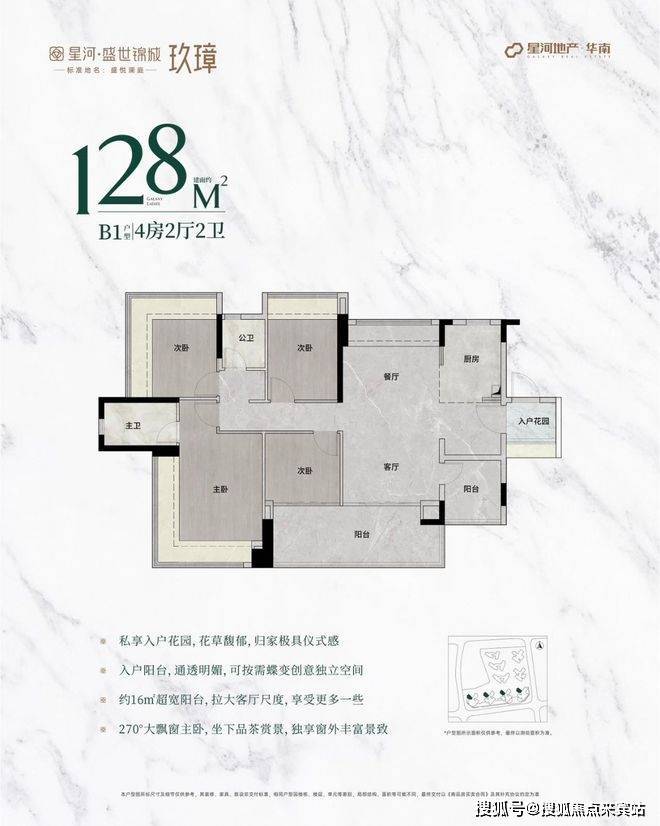 123-128平方米:独立入户花园设计,大幅提升厨房、客餐厅和主卧的使用空间。