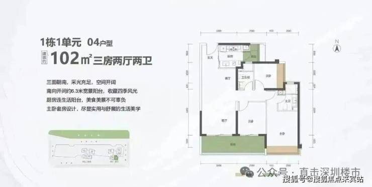 102㎡的3房2厅2卫,1栋1单元02户型,设计的是经典竖厅格局,进门入户玄关,客厅3.5米开间,LDKB一体化设计,三开间朝南,动静分区,客厅连接次卧出6.3米长的巨幕大阳台,二字型厨房还带1个生活阳台,卫生间干湿分离,西南朝向。