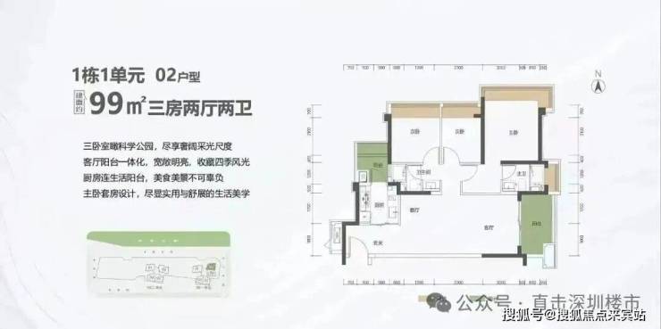 99㎡的3房2厅2卫,1栋1单元02户型,设计的是竖厅格局,客厅3.5米开间,LDKB一体化设计,进深11.31米,动静分区,三卧室朝东北向看科学公园,二字型厨房还带1个生活阳台,公卫三段式分离,阳台1.5米进深,东南朝向。