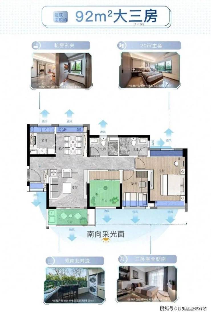 南北通透建面约92㎡大三房(2+1),东南向,单边位