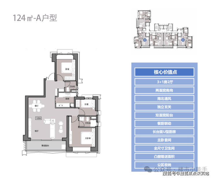 124㎡的3+1房2厅2卫(竖厅):位于2-30F,全朝南向,私家电梯厅的设置保证了独立的入户空间及体验感。
