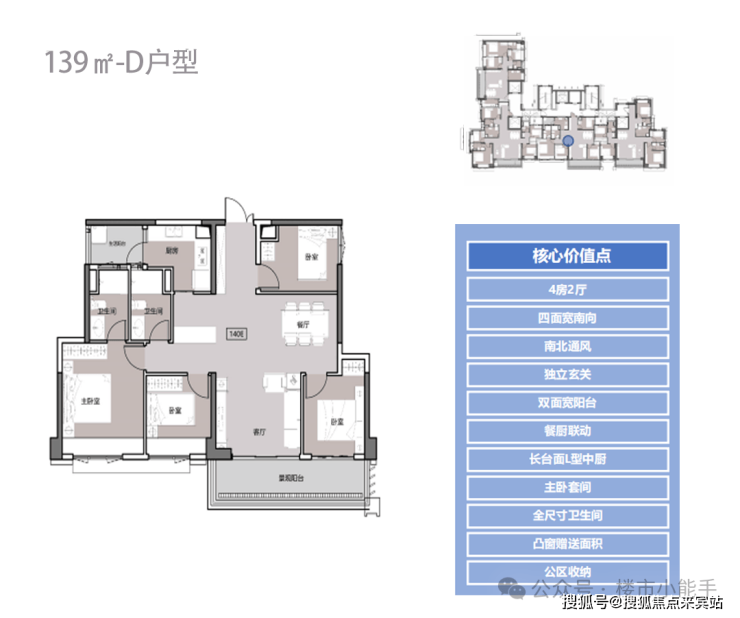 139㎡4房2厅2卫:位于32-43F高区,户数非常少,南向看海,独立电梯厅面积达到20㎡。