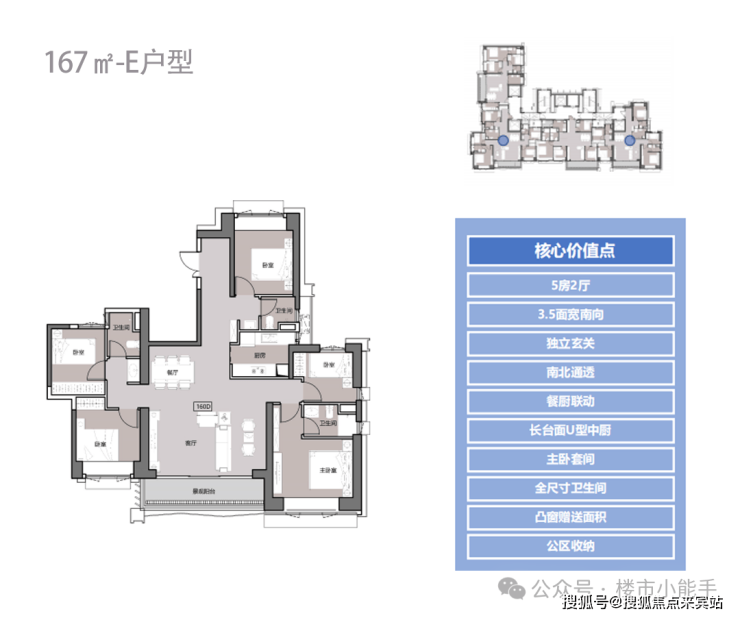 167㎡5+1房2厅3卫:位于32-43F高区,户数不多,南向看海,5+1房及3个卫生间的配置功能上完全满足了。