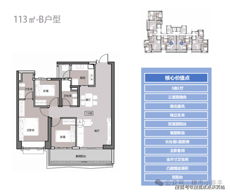 113㎡的3房2厅2卫:位于2-30F,全朝南向,带6.5米宽大阳台。