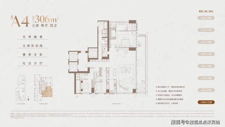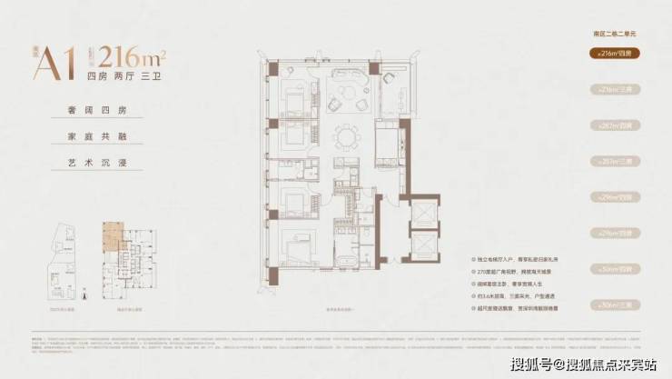 216㎡四房两厅三卫:入门顶豪,四房功能齐全,无保姆间,适合精英家庭;客厅 + 东向大阳台联动,阳台进深约 2.4 米;92%+ 实用率,框架核心筒无次梁,可微调布局。
