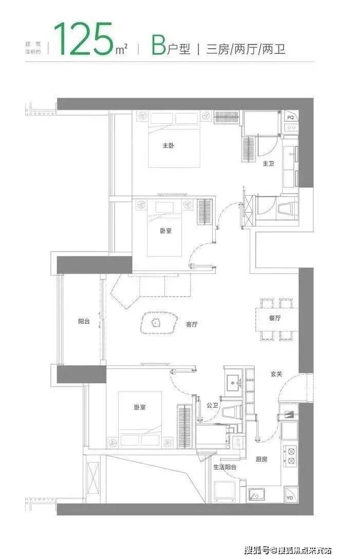 125㎡A 户型三房两厅两卫:为经典的三房两厅两卫竖厅设计,是货量最多的户型,有东南、西南等朝向。该户型飘窗、阳台设计可拉开居住视野,LDK 一体化设计打造了无边界、社交化的餐客厨系统。双阳台设计,厨房连通生活阳台,延展更多空间,便于收纳。