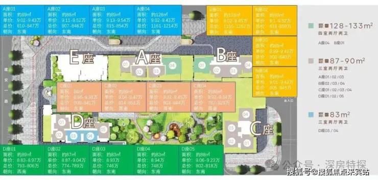 项目在售建面89-133㎡三至四房,全南向板楼设计,通风采光佳;建面89㎡三房两厅两卫,人生第一套房不必迁就;建面128-133㎡四房两厅两卫,阔绰奢宅,三代同堂的进阶之选,玖玖颂阁占地约1.4万㎡,建面约10.41万㎡,目前在售89㎡3房/128㎡4房。项目由5栋组成,E座为公租房,A~B-C座2梯4户,D座2梯5户, D座有部分回迁房,可售楼层为3-13层。