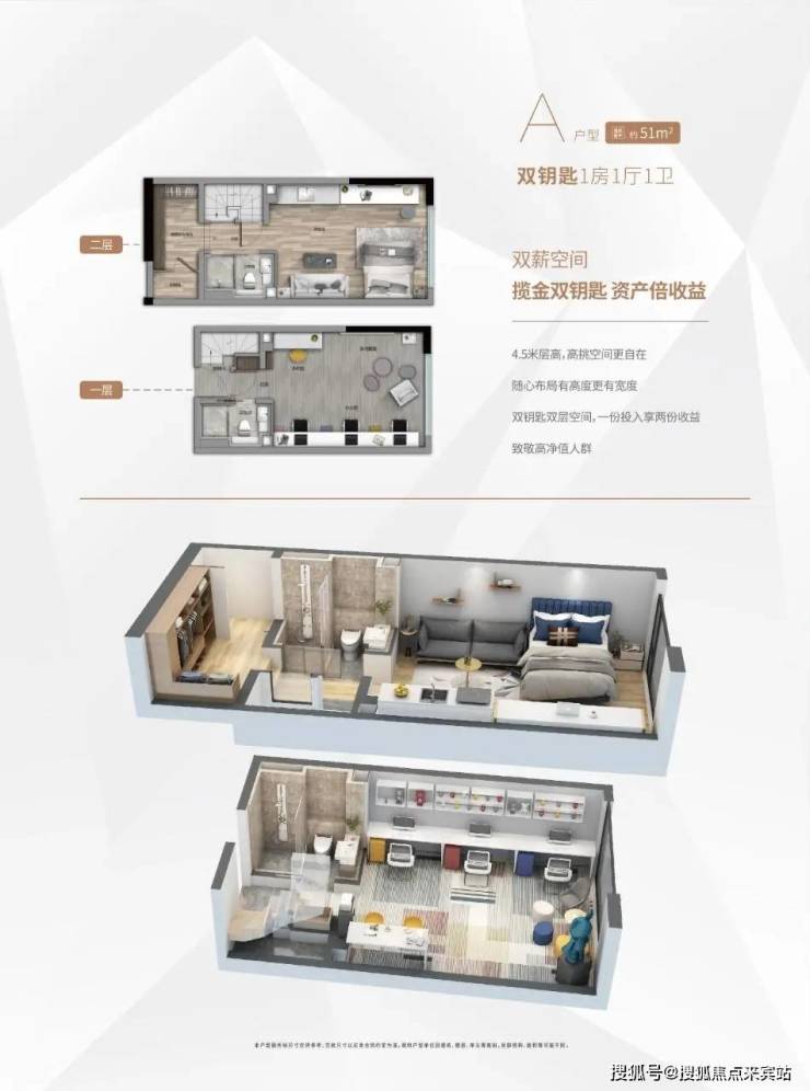 公寓部分规划了3栋21层高楼栋,4梯16户loft设计,共推出288套房源,户型层高4.5米,为精装交付。