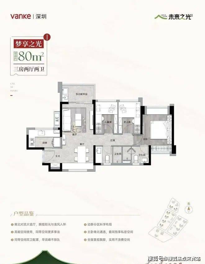 80㎡的3房2厅1卫,01.02/05/06户型,设计的是竖厅格局,进门入户玄关,LDKB一体化,S墙设计预留卡槽冰箱位,四开间朝南,U型厨房,卫生间干湿分离,得房率79.4%(不含赠送),西南或东南朝向。