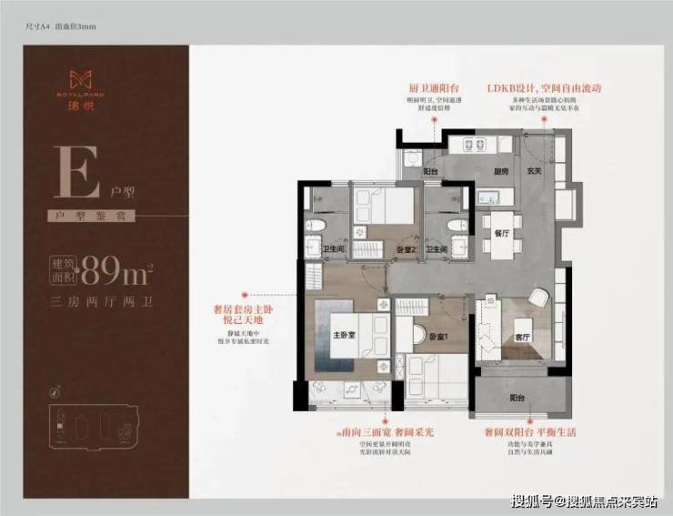 89㎡三房二卫A/B户型,位于1栋一单元,两开间阳台,主卧都有双面凸窗赠送。