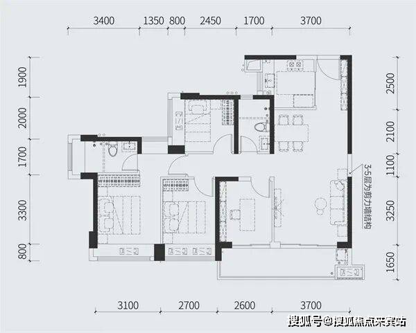 建面约97㎡三房两厅两卫双开间阳台设计 瞰四季阳光美景U形厨房格局 烹饪动线流畅高效