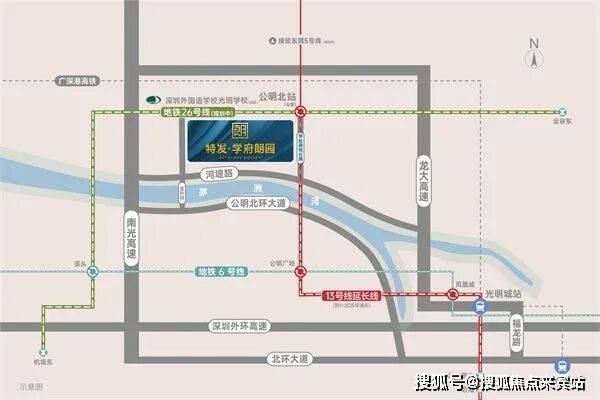 (截取13号线地铁部分站点)项目距13号线二期(北延)公明北站直线距离约200米,4站达公明广场,可换乘6号线通达宝安/光明/龙华/罗湖/福田双地铁:①13号线及其南、北延长线(建设中,预计2025年开通)起于东角头站,终于公明北站,纵贯光明、宝安、南山,线路开通后约30分钟可抵达南山核心区,约45分钟可达深圳湾口岸,以高新技术人才为主要客流,被称为高新技术人才专线②26号线(规划中)起于机场东站,终于公明北站,是连接光明、深圳西部中心及航城等外围组团中心的轨道线路,可快速通达粤港澳大湾区城市群及全球国际都市群,被称为国际机场专线双免费高速:项目周边还享有南光高速和龙大高速两条双免费高速的交通配套,快速通达全城