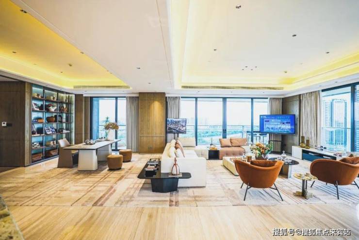 而位于吧台和书房前的近100㎡会客厅,被320°U型大阳台包围住,加上全落地窗的设计,空间尺度、景观视野拉到最大。