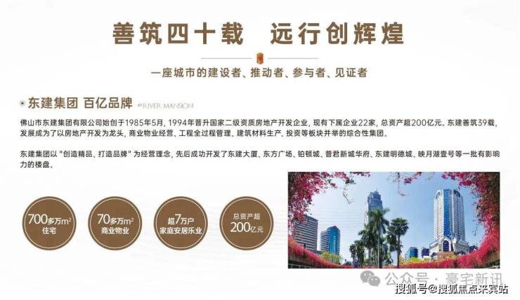 【天赋品牌 40载实力筑家】——东建集团,致力成为佛山最具价值的城市综合服务商,40年来累计开发了700多万㎡住宅和70多万㎡商业物业,筑就超7万户家庭安居乐业,总资产规模超200亿。