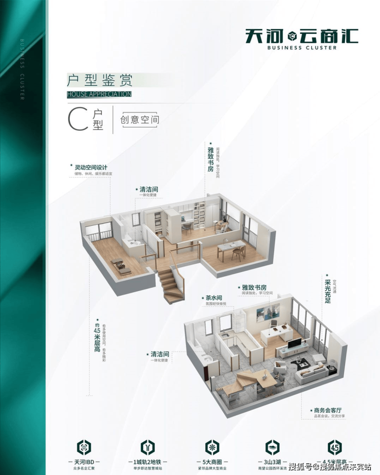 项目容积率仅2.0,全市罕有,筑造创意空间及企业公馆两大产品系,天河云商汇售楼处电话:400-901-9930,打造成集泛会所、创新创业、社交平台、休闲娱乐等于一体的全能型理享生活家场域。