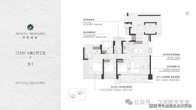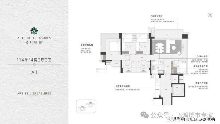 设计的是横厅格局,独立专梯入户,送约10㎡的私用公区,客餐厅6.8米开间,LDKB一体化设计,主卧270°无柱转角飘窗,赠送1个约1.6㎡设备平台,4个卧室分别做到了主卧20.6㎡/次卧10.45㎡/次卧10.45㎡/次卧7.12㎡(包含墙体飘窗),客餐厅出6米长的观景大阳台,U型厨房,烟道外置,卫生间干湿分离,得房率约77.7%(包含赠送),东北朝向看新安中学。套内面积89.48㎡+赠送24.92㎡=实用面积114.4㎡,加上得房率约99.32%(不含公区)。户型