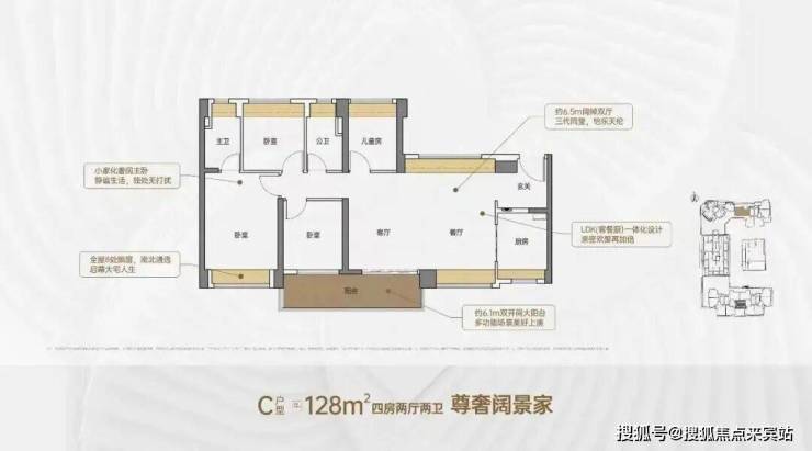 128㎡的4房2厅2卫,设计的是横厅南北通透格局,客餐厅6.5米开间,进门户玄关,LDKB一体化,客厅连接次卧出6.1米长的大阳台,主卧大套间设计,全屋8处飘窗,U型厨房,卫生间干湿分离,阳台主朝南向。