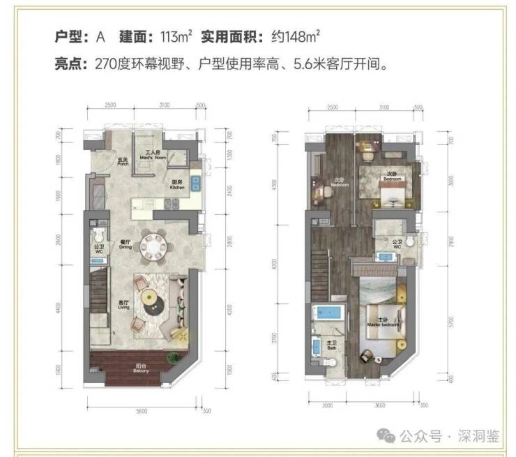 ★113㎡复式三房两厅三卫+工人房 南北通透三面景观,5.6米客厅与主卧开间,独具品位,尽享奢阔。