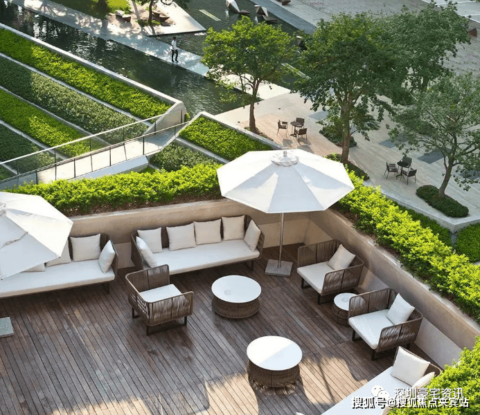 围合式庭院布局最大化构建着生态园林,采用密集的多层次花园种植,营造宁谧安静的休闲空间,辅以地形和水景的设计营造充满艺术感的休息环境。