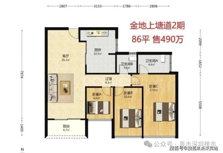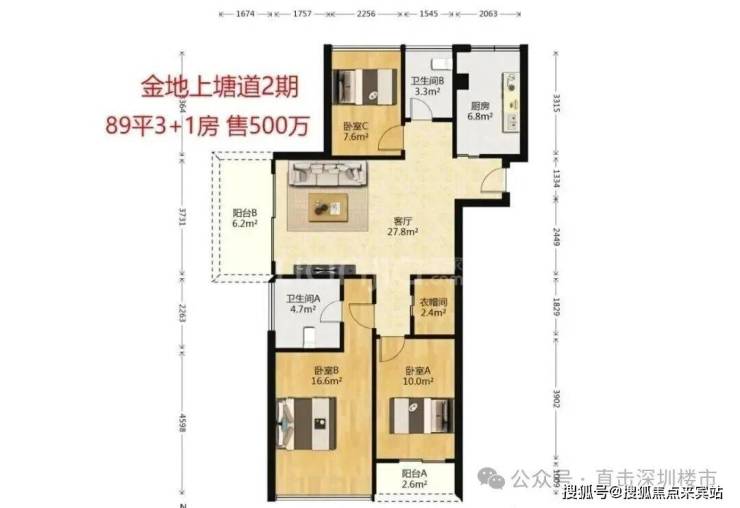 旁边的金地上塘道二期,一个89平的三房两卫户型是490万,89平的三加一房型则在500至510万之间,均价为5.7万。