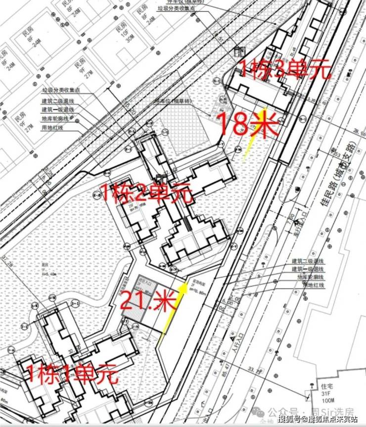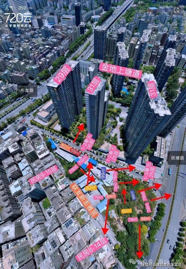 从楼栋的分布看,1栋2单元84平主卧到隔圳新村的间距是16.2米,1栋3单元有37米,3单元到金地上塘道二期是28.9米,1单元的78平离金地上塘道二期也有33米,这个距离还包含了佳民路本身的路宽,所以都算是“握手楼”的范畴,站在马路上就能看见里面的阳台和窗户。