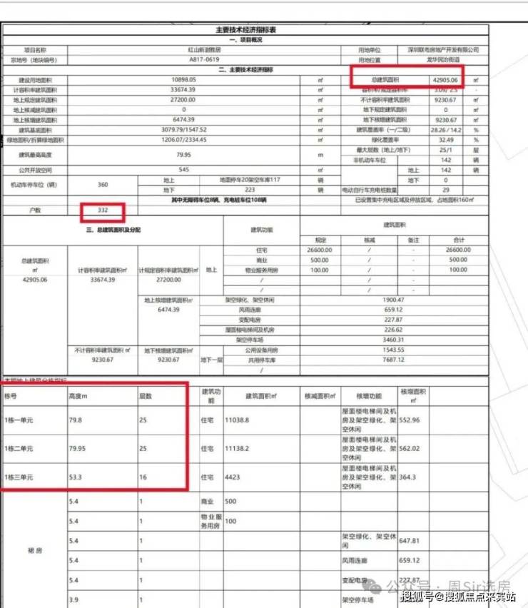 项目1栋1/2单元2梯6户,1栋3单元2梯4户设计,地下室有1层,规划360个车位,车位比1:1.08。