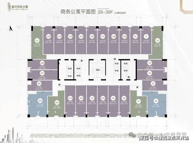 公寓8梯28户,办公6梯15户,商业4梯34户