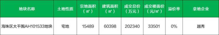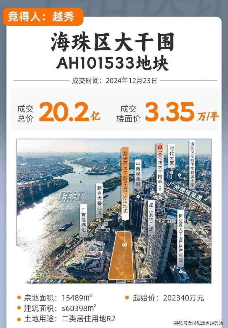 2024年12月23号,海珠大干围地块被越秀以20.23亿元拿下,楼面价为33501元/㎡。