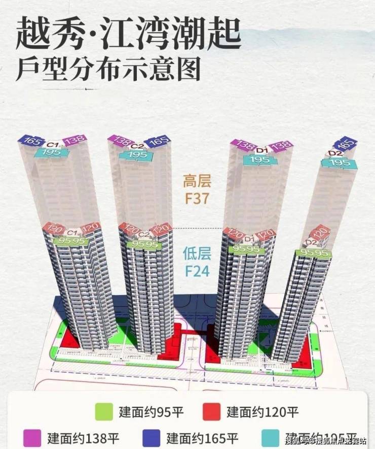 项目共规划4栋住宅楼,均为37层,分高低区设计,而且梯户比跟户型都各不相同: