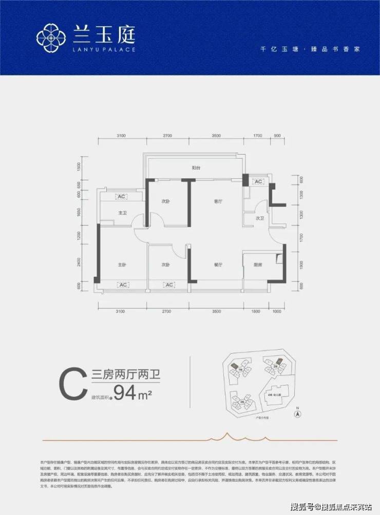94㎡的3房2厅2卫,C户型,设计的是竖厅南北通透格局,客厅开间3.5米,3个卧室分别做到了3.1米/2.7米/2.7米的宽度,客厅连接次卧出6.2米长的大阳台,U型厨房,公卫三段式分离,得房率约79%(不含赠送),阳台主朝西北或东北向。