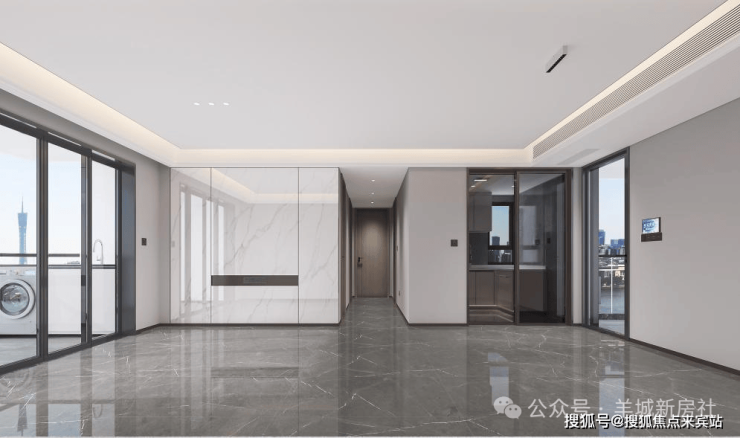 :“高山流水”线条+灰白高定立面,28米星空入户大堂、2.9米双层中空玻璃幕墙,勾勒灵动建筑形态;