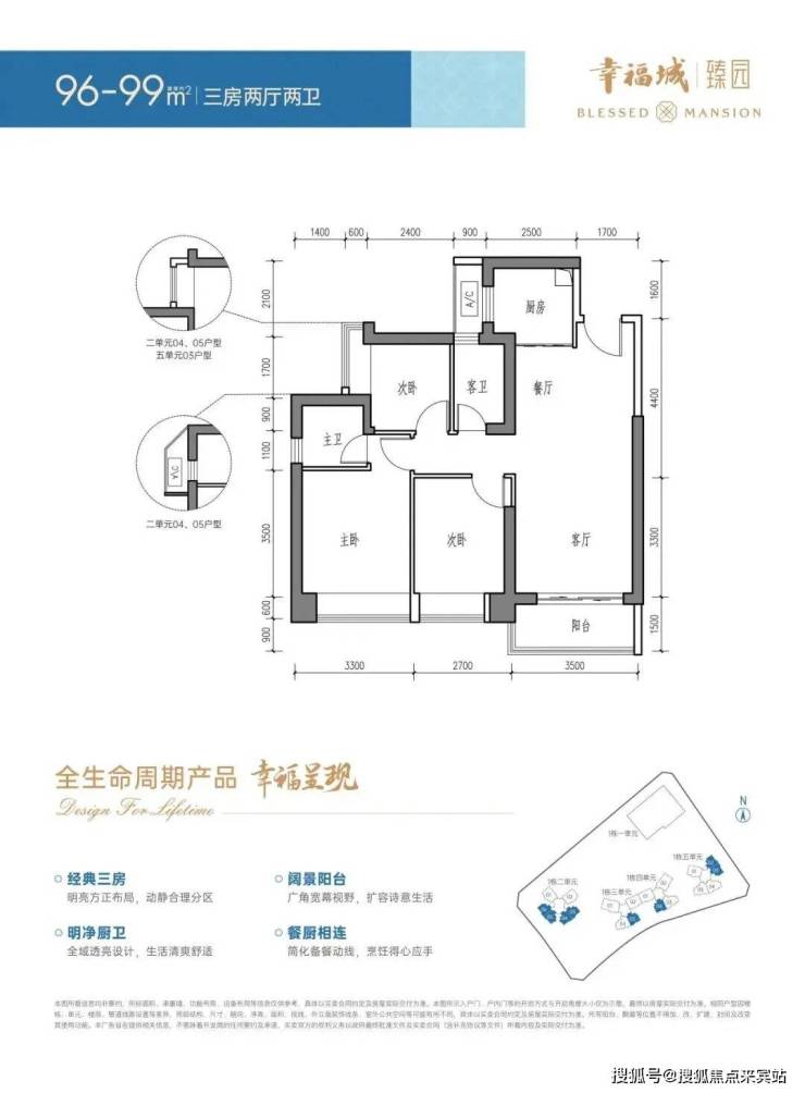96-99㎡的3房2厅2卫,经典竖厅格局,客厅3.5米开间,LDKB一体化设计,U型厨房,卫生间干湿分离。东南/西南或东北朝向,得房率75.9%(不含赠送),加上赠送后实际得房率约83.4%。