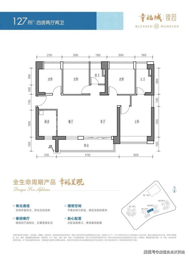 127㎡的4房2厅2卫,横厅南北通透格局,客餐厅6.7米开间,LDKB一体化设计,全屋6个飘窗面,客餐厅出10.05㎡的大阳台,U型厨房,卫生间干湿分离。阳台主朝东南向,得房率75.3%(不含赠送),加上赠送后实际得房率约86.23%。