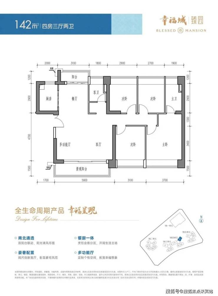 142㎡的4房3厅2卫,横厅南北通透格局,客厅5.9米开间,餐厨一体化设计,南北双阳台,全屋6个飘窗面,客厅出8.85㎡的观景大阳台,U型厨房,公卫三段式分离。阳台主朝东南向,得房率约75.3%(不含赠送),加上赠送后实际得房率约86.21%。