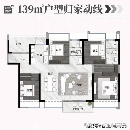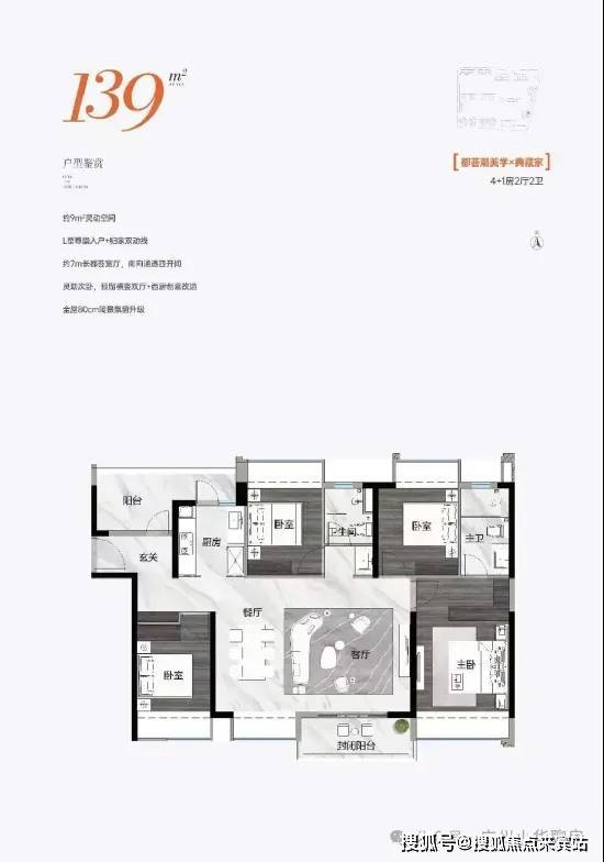 139㎡ 4+1房2厅2卫,约9㎡灵动空间,L型尊崇入户+归家双动线,约7m长都荟宽厅,南向通透四开间,灵动次卧,预留横竖双厅+西厨创意改造,全屋80cm阔景飘窗升级