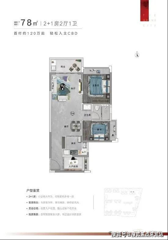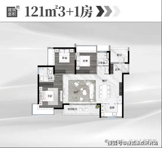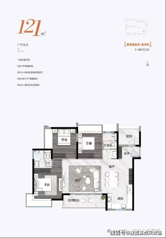 121㎡ 3+1房2厅2卫,+1房百变空间,L型入户尊崇体验,约8.1m长南北通透都荟宽厅,约5m长270°观景阳台,约46㎡豪宅式社交空间