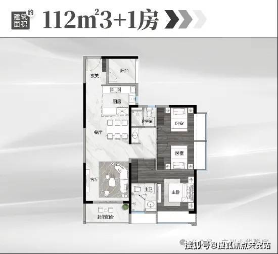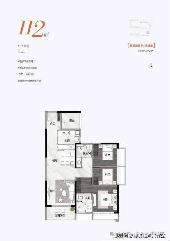 112㎡ 3+1房2厅2卫,+1房多功能空间,两梯四户南向低密度,LDKB一体化设计,全屋80cm阔景飘窗升级