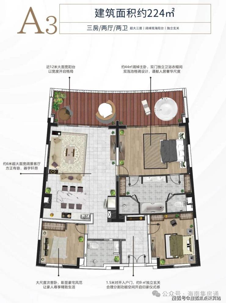A3户型约224平方米三房两厅两卫大阳台