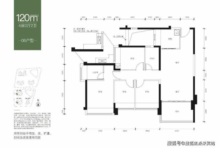04 109㎡的4房2厅2卫,设计有2个户型,1个是双龙抱珠格局,客厅3.8米开间,东南朝向;1个是横厅南北通透格局。