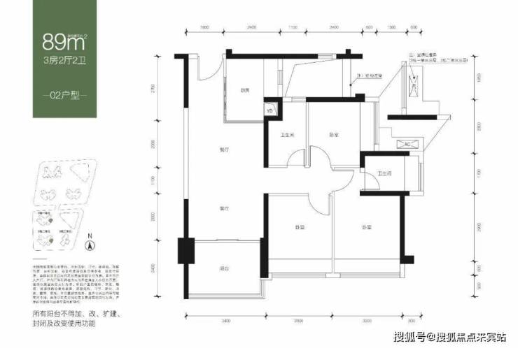 02 89㎡的3房2厅2卫户型,设计的是传统竖厅格局,客厅3.4米开间,02-03户型是东南朝向,05户型是西南朝向。