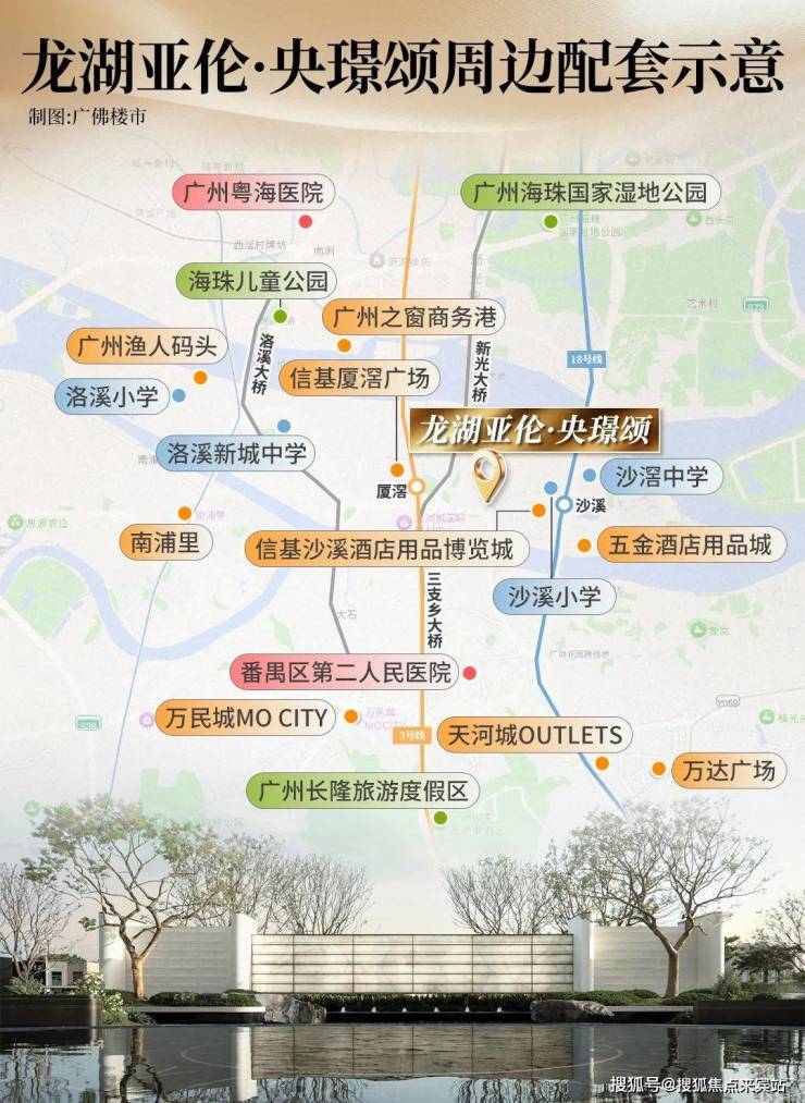 项目距离地铁18号线沙溪站约600米,3号线厦滘站约1.2公里。1站到万博、2站到琶洲、3站直达珠江新城(冼村站)。
