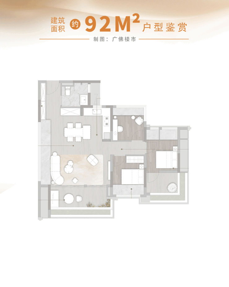 在这个户型中,空间一跃升级为PLUS版本,整个LDKGX超大尺度方厅建面高达约60㎡,妥妥一个小户型的总面积。