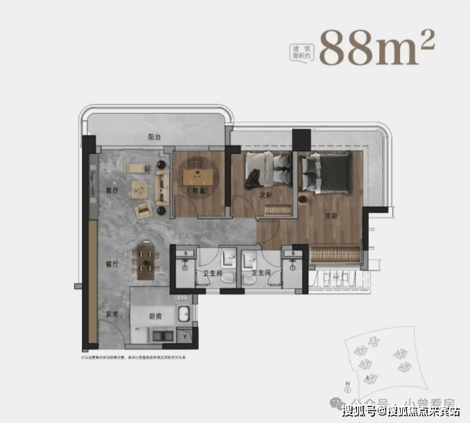 最受刚需关注的是88㎡三房两卫,采用新规设计,实用率很高,做到了3房2厅2卫的格局,就算和老人同住也不局促。客厅4米开间,搭配LDKB一体化设计,餐客厨连在一起,朋友聚餐也不拥挤。主卧带有270°弧形飘窗,还预留了衣柜位置,总价300万出头就能拿下,部分一口价单位性价比更突出。