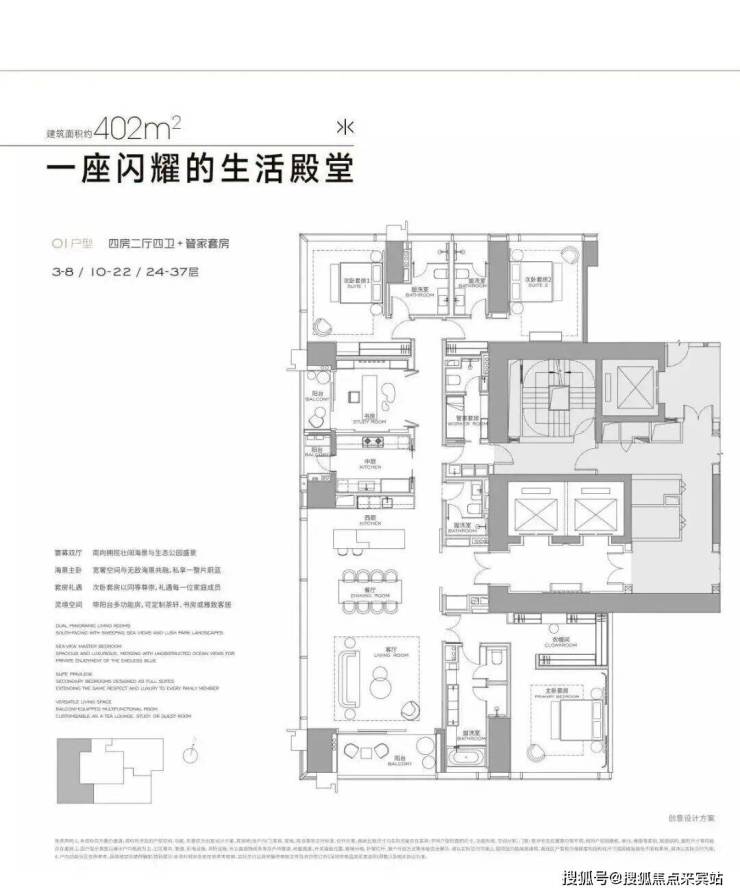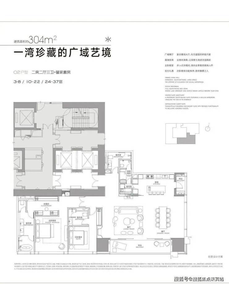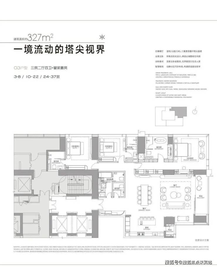 首推3栋低区户型(3-37F),高区570-1032㎡还没出样板间:实地样板间304/327/402㎡三个户型,全是"大空间+家政套间",卧室基本都是套间,所有户型都很有舒适度,整个楼栋外立面是玻璃幕墙,这样的设计采光和景观都很好。