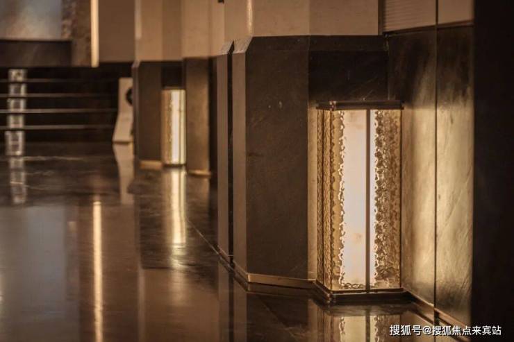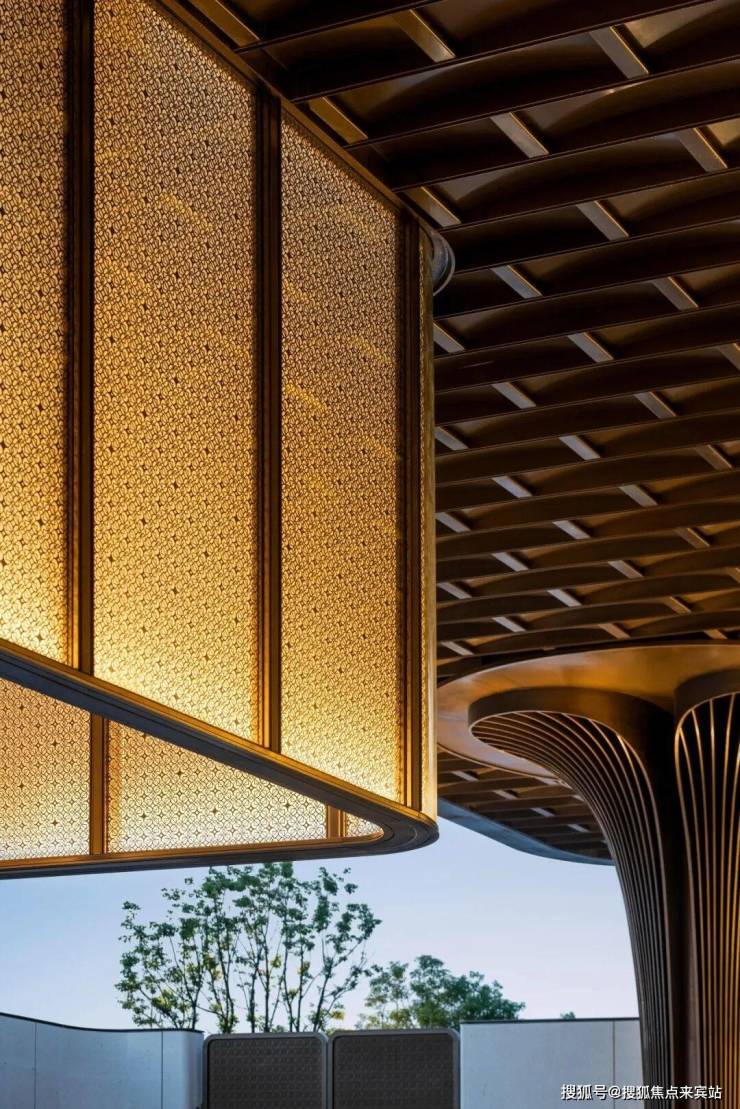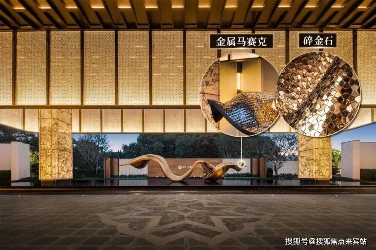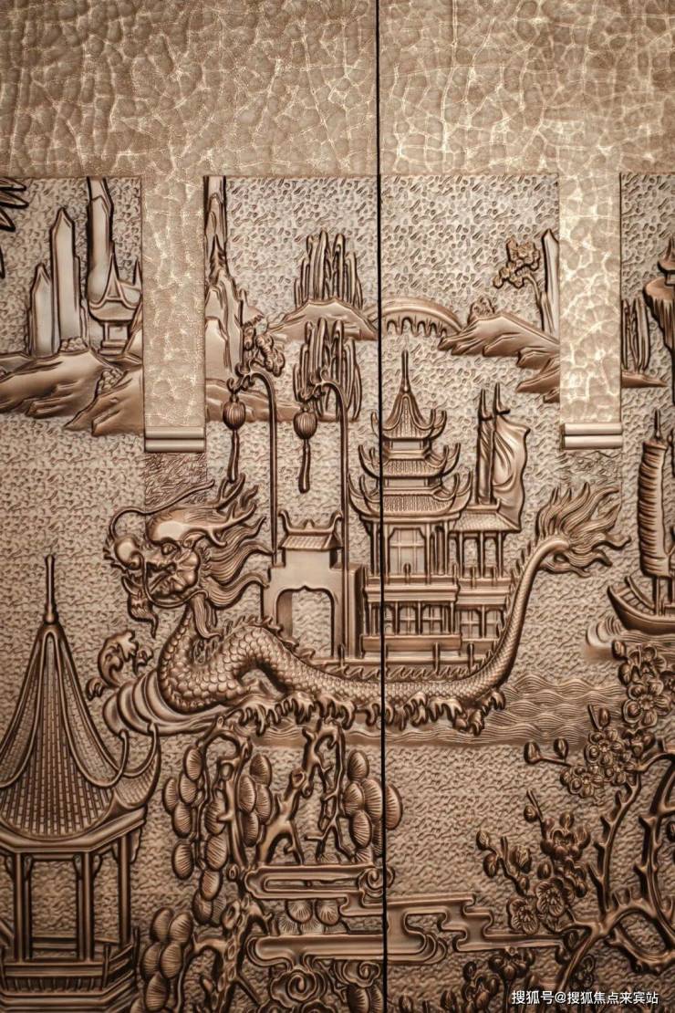 会所入口左侧,金鳞墙由2400片古铜色不锈钢电镀拉丝成型,实现龙鳞浮动的流体美学。